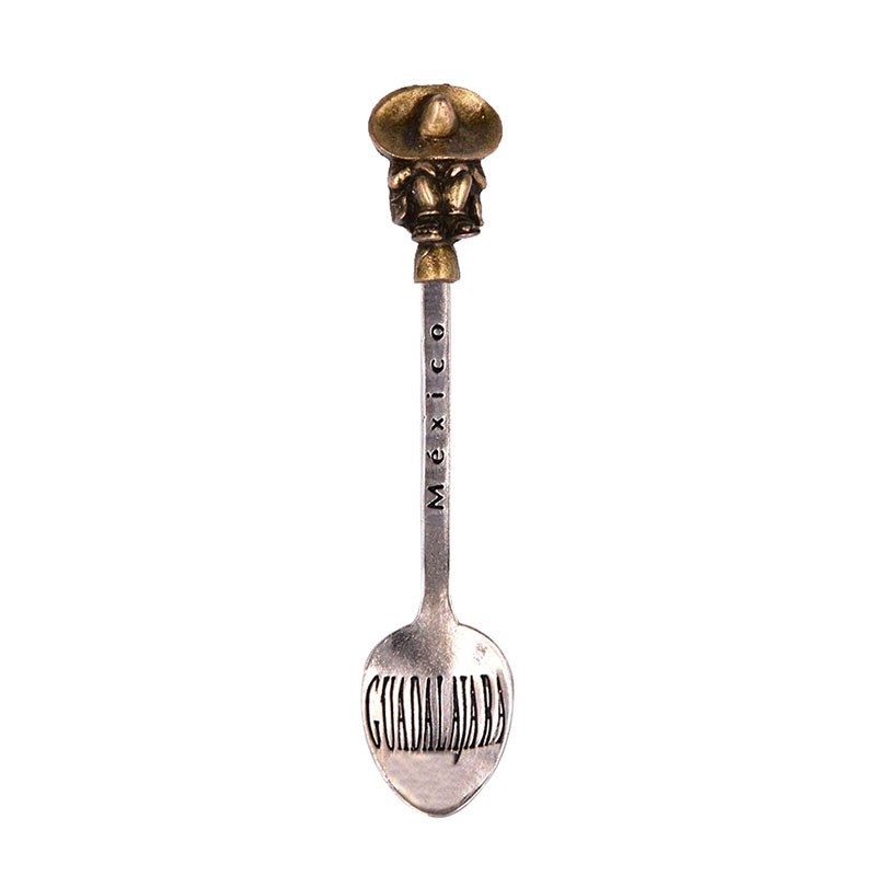 Cuchara de colección latón con la figura de un indio sentado, típico de México. Hecho en México, es un souvenir ideal para que los turistas recuerden sus vacaciones en Guadalajara.