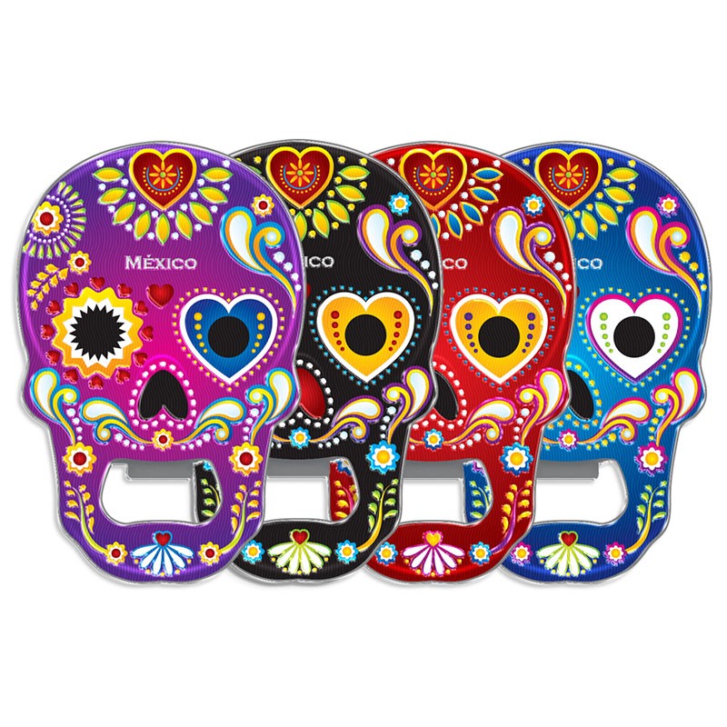 Ese magneto destapador en forma de calavera, típica de la tradición del día de Muertos en México sorprende por sus reflejos y brillos. Disponible en 4 colores, azul, amarillo, negro y rosa, es el souvenir inolvidable de unas vacaciones en Puebla.