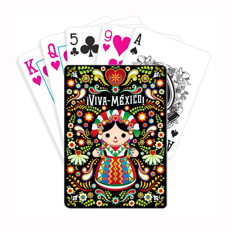 Barajas con una muñeca, típica del folklor en México. Ilustracion fondo negro, incluye 52 naipes + 4 jokers envueltos en celofan empaquetados en caja de plastico para mayor proteccion. Con sus numeros jumbo para una mejor lectura y su calidad profesional, es el mejor souvenir para jugar con amigos y recordar sus vacaciones en Puebla.