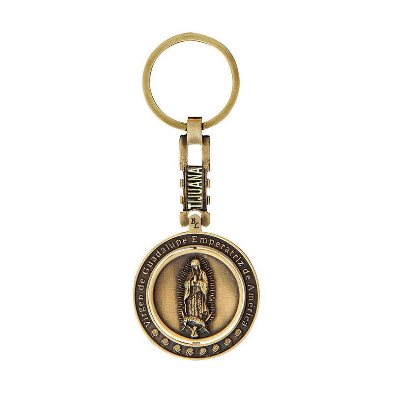 Llavero giratorio de latón con la ilustración de la virgen de Guadalupe, Nuestra Señora de las Americas. El souvenir ideal para recordar sus vacaciones en Tijuana.