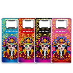 Ese destapador con la ilustración de una catrina, típica de la tradición del día de Muertos en México sorprende por sus reflejos y brillos. Disponible en 4 colores, azul, rojo, negro y rosa, es el souvenir inolvidable que pediran los turistas de visita en tu tienda de Acapulco.