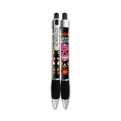 Pluma con la ilustración de una calavera, típica de la tradición del día de Muertos en México. Disponible en 4 colores, amarillo, azul, negro, morado, es un recuerdo económico y útil de unas vacaciones en Acapulco.