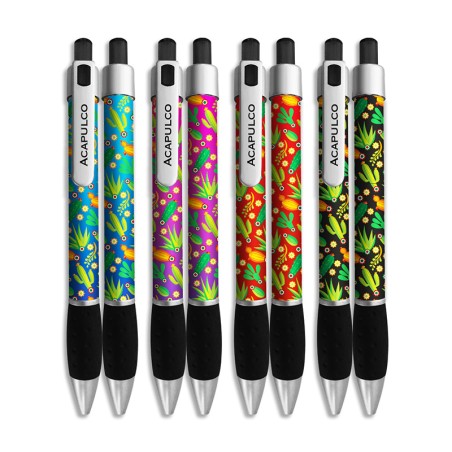 Pluma con la ilustración de un cactus, típico de la flor en México. Disponible en 4 colores, amarillo, azul, negro, morado, es un recuerdo económico y útil de unas vacaciones en Acapulco.