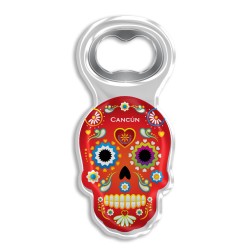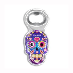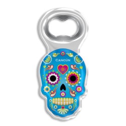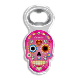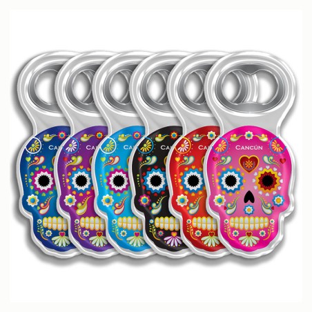 Destapador de acrílico en forma de calavera tipica de la tradicion del dîa de muertos en México. Útil y decorativo, disponible en 8 figuras y colores diferentes, es un souvenir ideal para que los turistas recuerden sus vacaciones en Cancún.