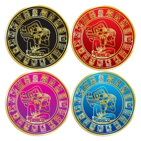 Ese set de 4 portavasos Calendario Maya, emblemático de la cultura Maya en México es el articulo de éxito para tu negocio de souvenir con sus reflejos metalicos impresionantes. Disponible en 4 colores diferentes, rojo, azul, negro, rosa es un souvenir original y útil para tomar unas copas recordando la cultura prehíspanica de México.