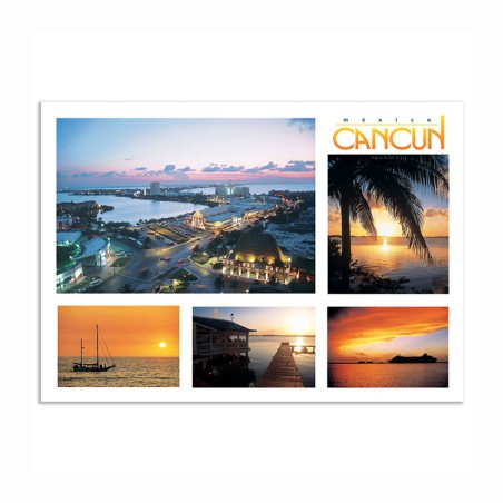 Tarjeta postal con varias vistas de Cancún al atardecer. Con sus hermosas tomas y su calidad profesional es un articulo base para el turista viajando en México y la mejor forma de compartir sus vacaciones.