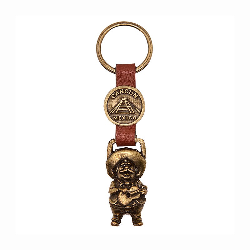 • Llavero de latón con la ilustración de un mariachi tocando guitara. Souvenir de Cancún, México