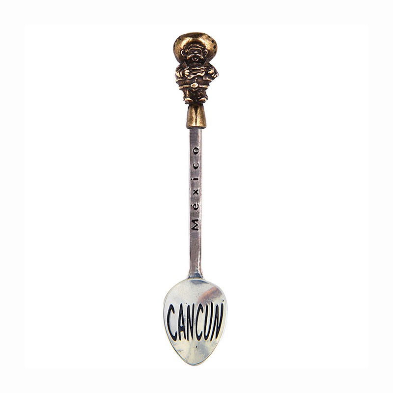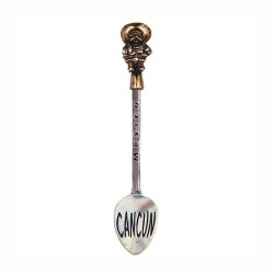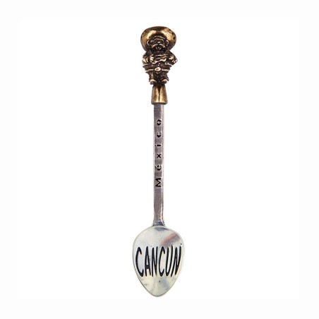 Cuchara de colección latón con la figura de un mariachi tocando guitara, típico de México. Hecho en México, es un souvenir ideal para que los turistas recuerden sus vacaciones en Cancún.