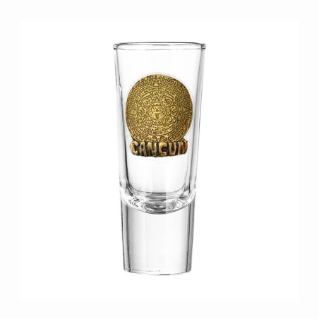 Un tequilero con la ilustración del Calendario Azteca, emblemático de México para disfrutar el tradicional tequila mexicano recordando sus vacaciones en Cancún.