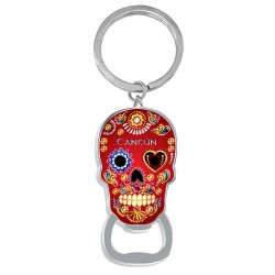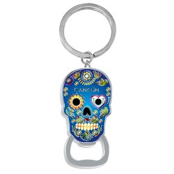 Ese Llavero destapador con la forma de una calavera, típica de la tradición del día de Muertos en México sorprende por sus reflejos y brillos. Disponible en 4 colores, azul, rojo, negro y rosa, es el souvenir inolvidable de unas vacaciones en Cancun.