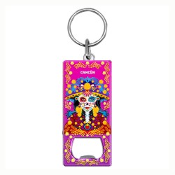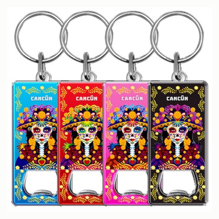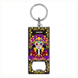 Ese Llavero con la ilustración de una catrina, típica de la tradición del día de Muertos en México sorprende por sus reflejos y brillos. Disponible en 4 colores, azul, rojo, negro y rosa, es el souvenir inolvidable de unas vacaciones en Cancún.