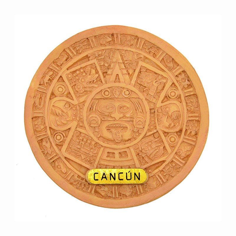 Magneto de resina en forma de un calendario azteca, emblemático de México. El souvenir ideal para pegar en el refrigerador y recordar sus vacaciones en Cancún.