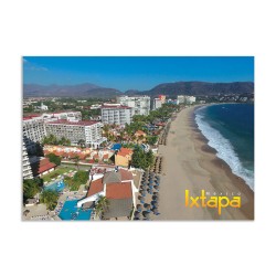Tarjeta postal de la Zona Hotelera de Ixtapa. Con su vista panoramica y su impresion en cartulina importada de primera calidad, es un articulo base para el turista viajando en México y la mejor forma de compartir sus vacaciones en Ixtapa, México.