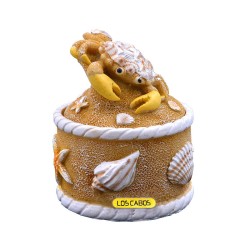 Ese alhajero de resina con acabado arena es ideal para guardar joyerias o pequeños tesoros. Su diseño y la figura de un cangrejo representan las maravillosas playas de Los Cabos. Con su plaquita del destino, es el souvenir perfecto para recordar a México.