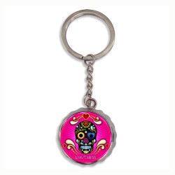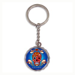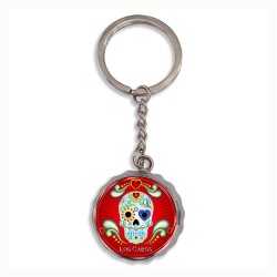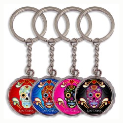 Llavero corcholata de metal con calaveras, tipícas del Día de muertos en México. Disponible en 4 colores diferentes, amarillo, negro, rojo, azul, es un souvenir de mucho exito ideal para recordar las bonitas tradiciones de México.