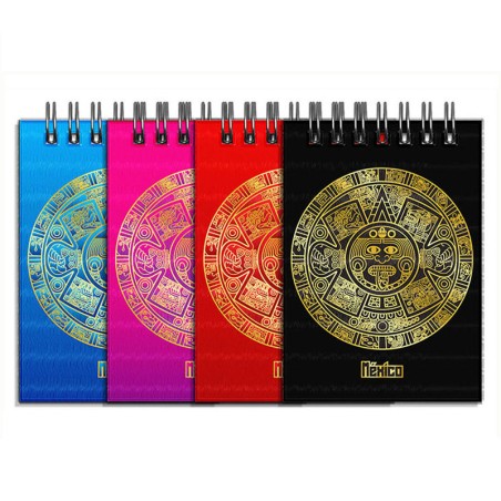 Libreta de apunte con la ilustracion del Calendario Azteca, emblemático de la cultura prehispánica en México. Disponible en 4 colores diferentes, rojo, azul, negro, rosa, es un regalo útil y original para tu tienda de la península de Yucatán.