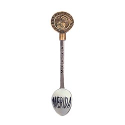 Cuchara de colección latón con la ilustración del Calendario Maya, emblemática de la civilización maya en México. Hecho en el territorio nacional, es un souvenir ideal para que los turistas recuerden sus vacaciones en Mérida.