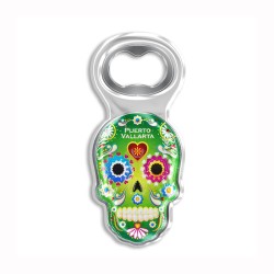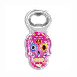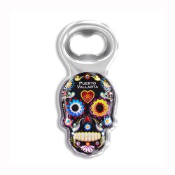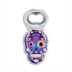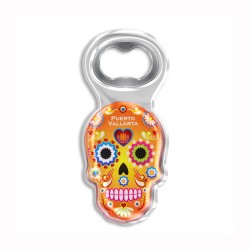 Destapador de acrílico en forma de calavera para recordar la tradicion del día de muerto en México. Útil y decorativo, disponible en 8 figuras y colores diferentes, es un souvenir ideal para que los turistas recuerden sus vacaciones en Puerto Vallarta.