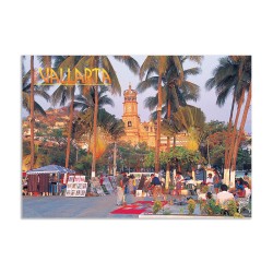 Tarjeta postal de la iglesia de Puerto Vallarta y Palmeras. Con sus vista hermosa y su impresion en cartulina importada de primera calidad, es un articulo base para el turista viajando en México y la mejor forma de compartir sus vacaciones en Puerto Vallarta, México.