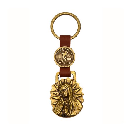 Llavero de latón con la figura de la Virgen de Guadalupe, emblemática de México y la mas importante de Latino America. Hecho en México, es el souvenir ideal para los turistas de vacaciones en Puerto Vallarta.