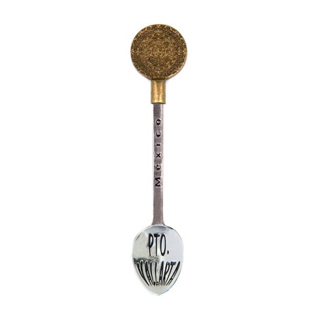 Cuchara de colección latón con la ilustración del Calendario Azteca, emblemático de México. Hecho en el territorio nacional, es un souvenir ideal para que los turistas recuerden sus vacaciones en Puerto Vallarta.