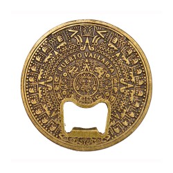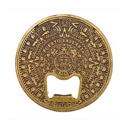 Destapador de latón con la ilustración del Calendario Azteca, emblemático de México. Hecho en el territorio nacional, es un souvenir útil que se puede pegar en el refrigerador para recordar sus vacaciones en Puerto Vallarta.