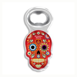 Destapador de acrílico en forma de calavera típico del dia de muerto en México. Útil y decorativo, disponible en 6 figuras y colores diferentes, es un souvenir ideal para que los turistas recuerden sus vacaciones en la Riviera Maya.