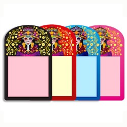 Ese bloc de notas catrina con Iman, típico del día de muertos en México es el articulo de éxito para tu negocio de souvenir con sus reflejos metalicos sorprendentes. Disponible en 4 colores diferentes, amarillo, azul, negro, rosa, tus clientes lo compraran para pegarlo en su refrigerador y apuntar recordatorios.