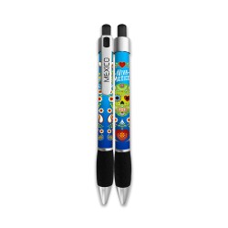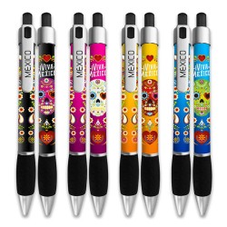 Pluma con la ilustración de una calavera, típica de la tradición del día de Muertos en México. Disponible en 4 colores, amarillo, azul, negro, morado, es un recuerdo económico y útil de unas vacaciones en la Ciudad de México, CDMX.