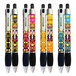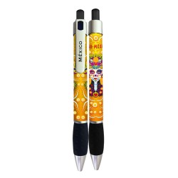 Pluma con la ilustración de una catrina, típica de la tradición del día de Muertos en México. Disponible en 4 colores, amarillo, azul, negro, morado, es un recuerdo económico y útil de unas vacaciones en la Ciudad de México, CDMX.