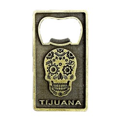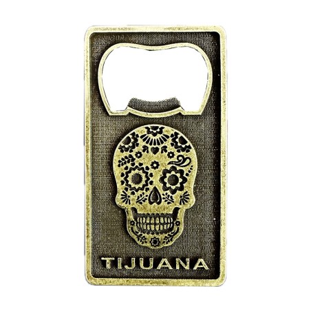 Destapador de latón con la ilustración de una calavera, típica de la tradición del día de Muertos en México. El souvenir ideal para recordar sus vacaciones en Tijuana.